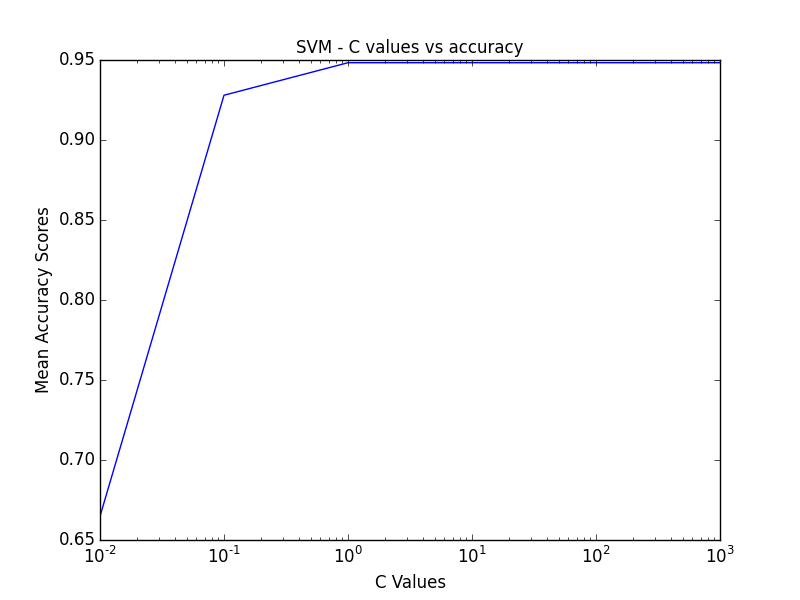 We plot below the accuracy we get according to the C values (as above) on Breast Cancer Wisconsin (Original) data set from the UCI Machine Learning repository.