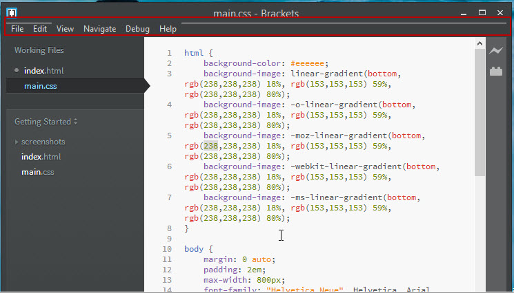 At step5, when hover mouse on different menus, the white line will be overlapped by the menus. When click anywhere on the Brackets, the white line will disappear.