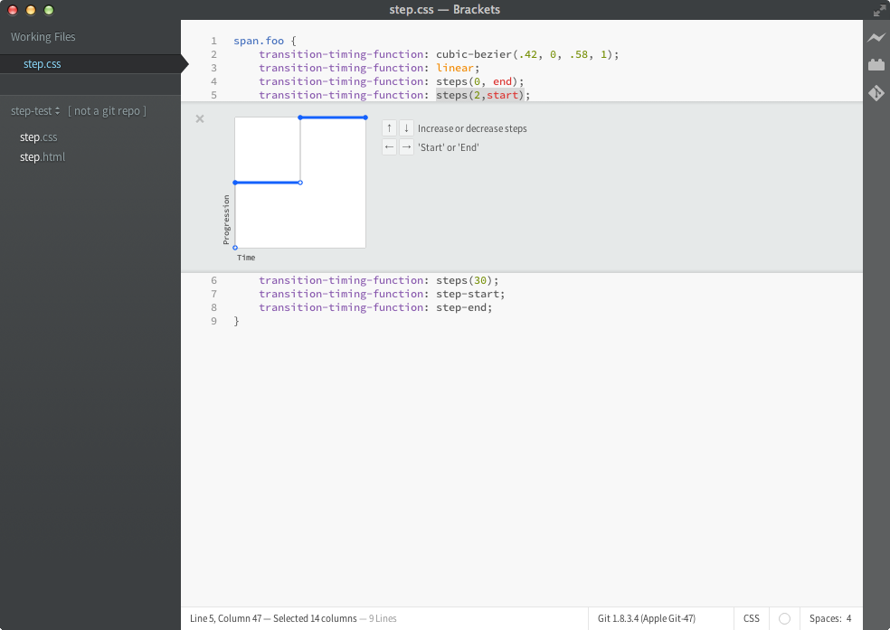 I like that! Is that format used anywhere else in Brackets so I could re-use the boxes and background-color? I also added info text to cubic-bezier() editor, so that's why I was asking about mouse click and drag. Suggestions? |