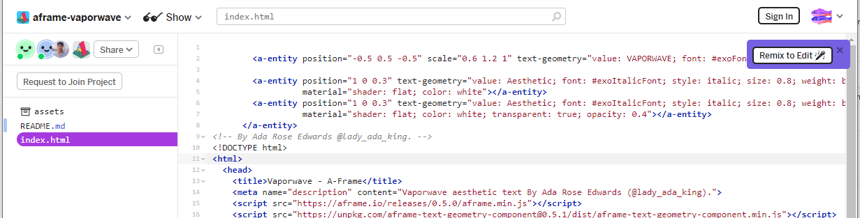The aframe vaporwave example on glitch: https://glitch.com/edit/#!/aframe-vaporwave?path=index.html:11:6 Is broken and only partially rendering:  Compared to the homepage:  It looks like the missing elements were accidentally moved above the html tag: