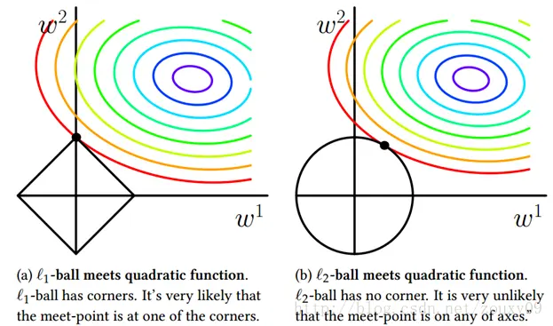 L1正则方法具有稀疏解的特性,直观从二维解空间来看L1-ball 为正方形,在顶点处时(如W2=C, W1=0的稀疏解),更容易达到最优解。可见基于L1正则方法的会趋向于产生少量的特征,而其他的特征都为0。