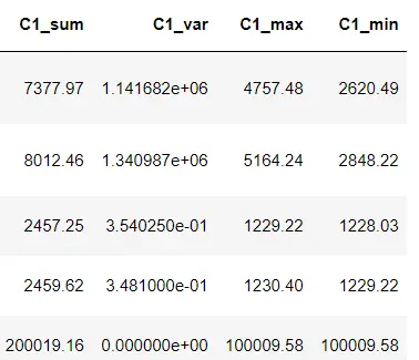 # 以cust_no做聚合,C1字段统计个数、唯一数、平均值、中位数、标准差、总和、最大、最小值