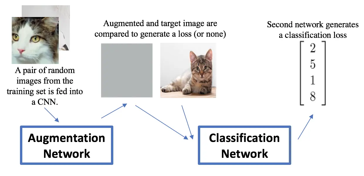 神经增强(Neural augmentation)是通过神经网络组的学习以获得较优的数据增强并改善分类效果的一种方法。 其方法步骤如下: