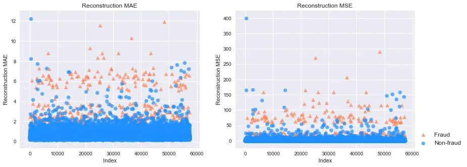 # 下图分别是MAE和MSE重构误差,其中橘黄色的点是信用欺诈,也就是异常点;蓝色是正常点。我们可以看出异常点的重构误差整体很高。