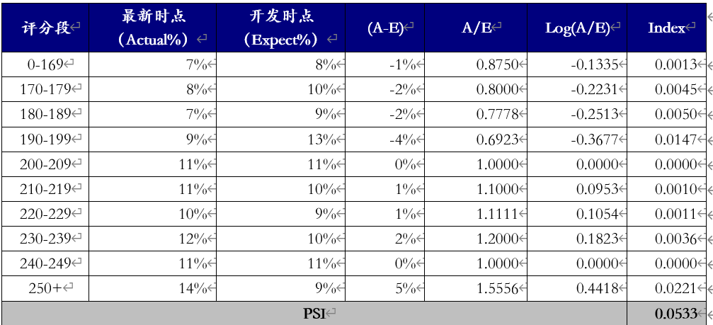 - step3:计算各分箱内的A - E和Ln(A / E),计算index = (实际占比 - 预期占比)* ln(实际占比 / 预期占比) 。