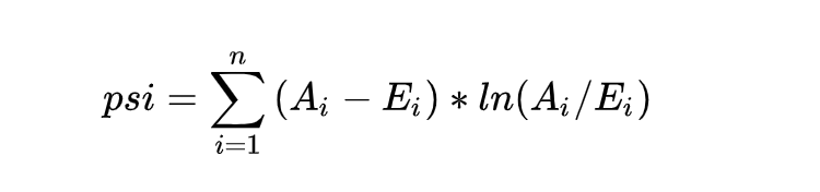 PSI计算以训练样本的模型评分作为稳定性的参考点(预期分数占比),衡量未来的实际预测分数(实际分布占比)的误差情况。计算公式为 SUM(各分数段的 (实际占比 - 预期占比)* ln(实际占比 / 预期占比) )