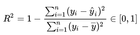 这样,R^2分数范围被归约到了[0,1],当其值为0时,意味着我们的模型没有什么效果,和baseline模型那样猜的效果一致。当值为1,模型效果最好,意味着模型没有任何误差。
