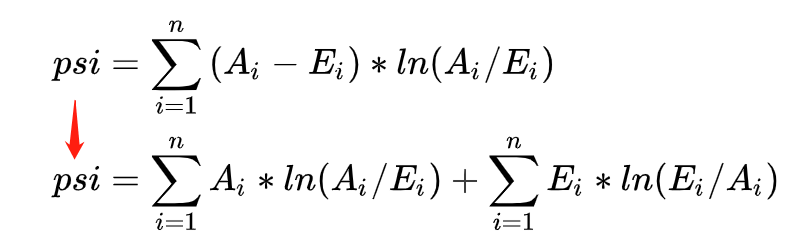 分析psi指标原理,经过公式变形,我们可以发现psi的含义等同于第一项实际分布(A)与预期分布(E)的KL散度 + 第二项预期分布(E)与实际分布(A)之间的KL散度之和,KL散度可以单向(非对称性指标)地描述信息熵差异,上式更为综合地描述分布的差异情况。