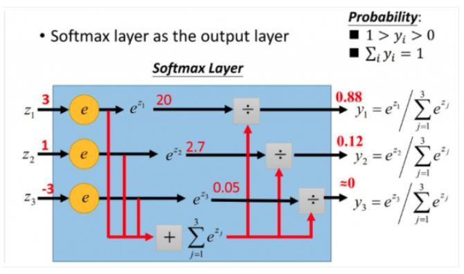 另外一种,将Sigmoid激活函数换成softmax函数,相应的模型也可以叫做多元逻辑回归(Multinomial Logistic Regression),即可适用于多分类的场景。softmax函数简单来说就是将多个神经元(神经元数目为类别数)输出的结果映射到各输出的占比(范围0~1, 占比可以理解成概率),我们通过选择概率最大输出类别作为预测类别。