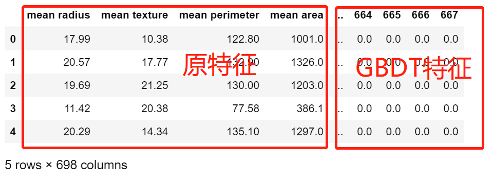 如下GBDT+LR的代码实现(基于癌细胞数据集),提取GBDT特征,并与原特征拼接: