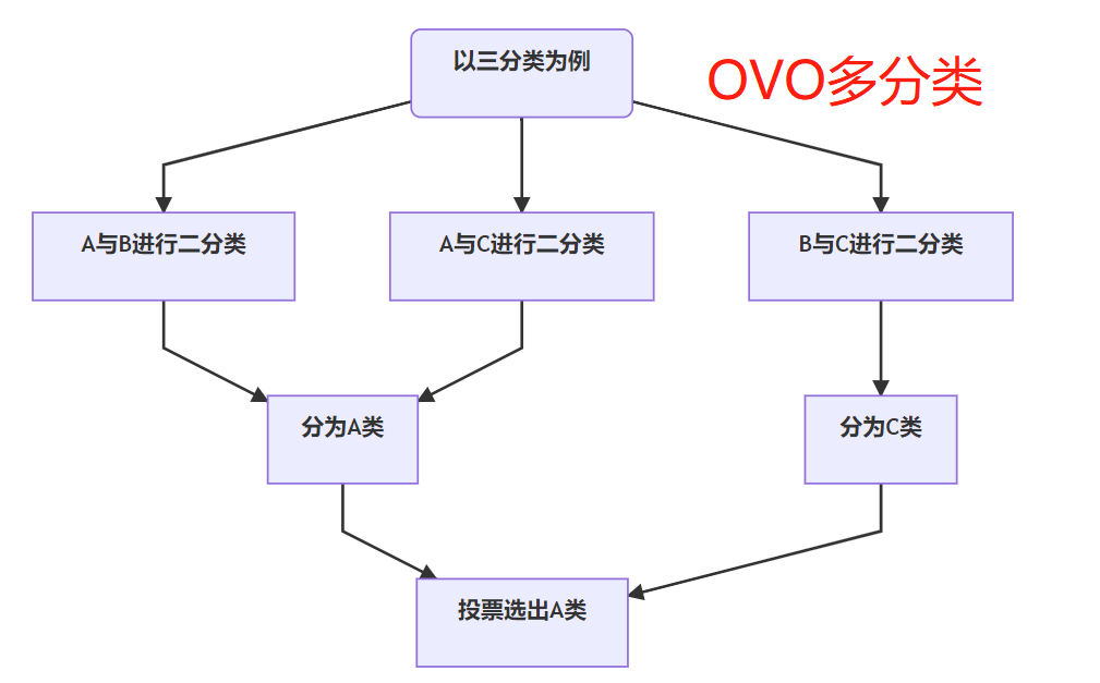 OVO(One vs One)每个分类器只挑两个类别做二分类, 得出属于哪一类,最后把所有分类器的结果放在一起, 选择最多的那个类别,如下图:
