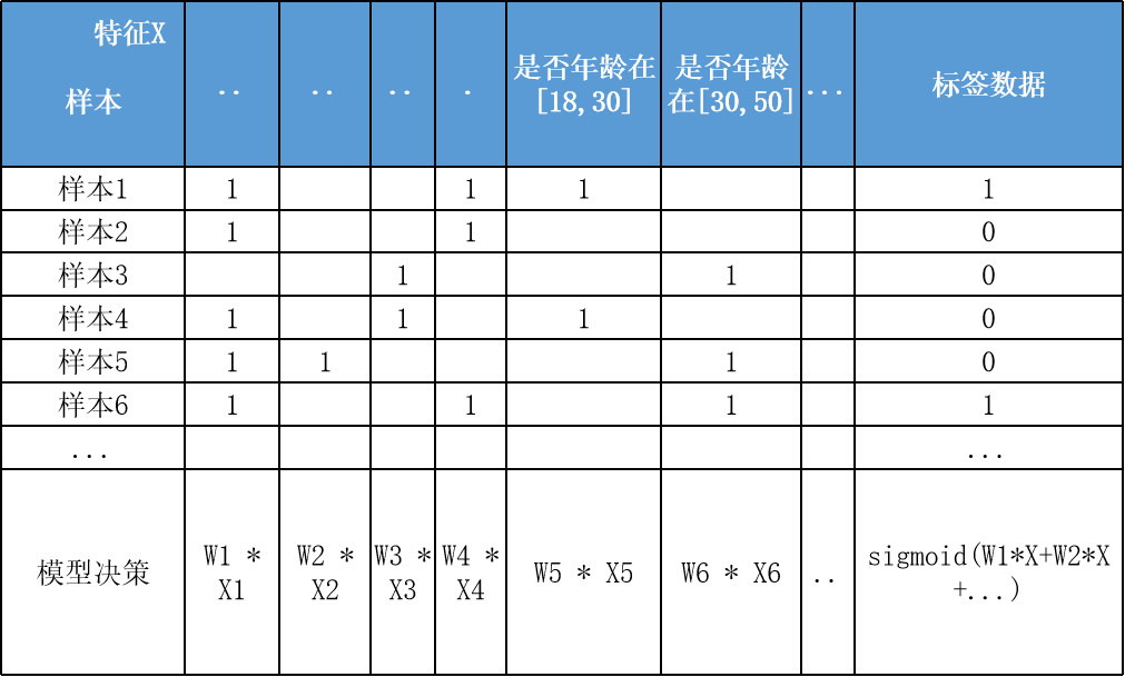 但是对于年龄这个特征来说,不同的年龄值,对模型预测是否会存款,应该不是线性关系,比如0-18岁可能对于存款是负相关,19-55对于存款可能就正相关。这意味着不同的特征值,需要不同模型参数来更好地表达。也就是通过对特征进行离散化,比如年龄可以离散化以及哑编码(onehot)转换成4个特征(if_age<18, if_18<age<30,if_30<age<55,if_55<age )输入lr模型,就可以用4个模型参数分别控制这4个离散特征的表达:sigmoid(...+age1 * w1+age2 * w2..),这明显可以增加模型的非线性表达,提高了拟合能力。