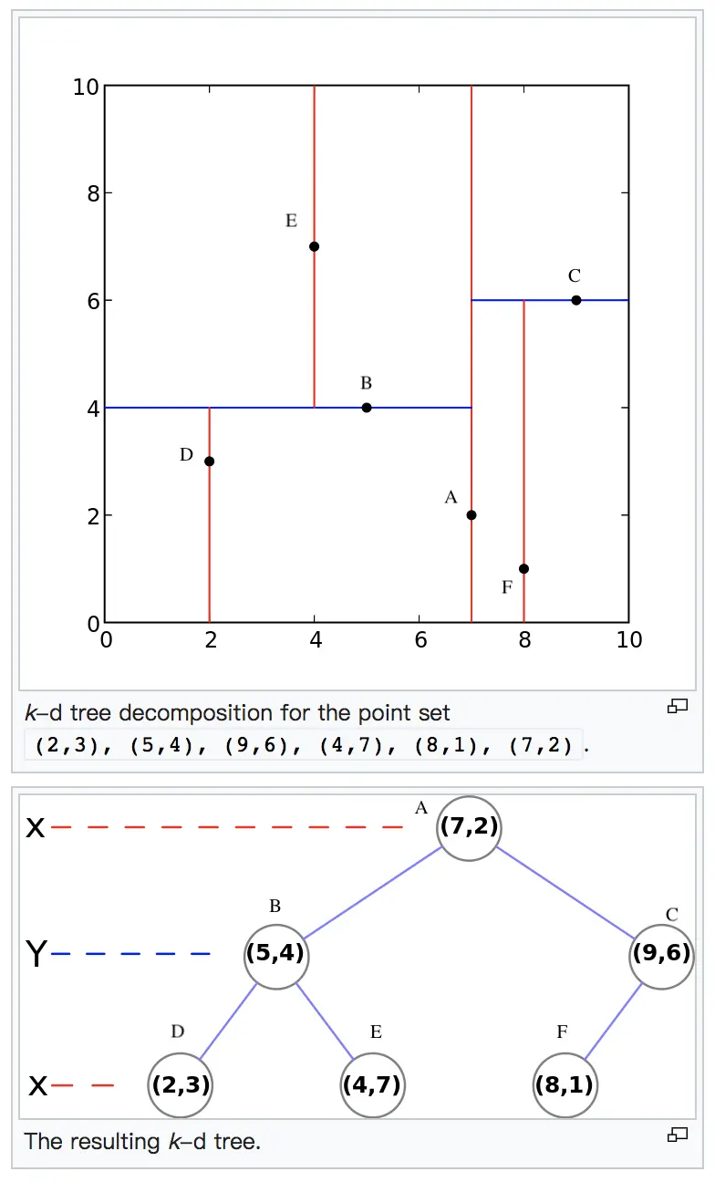 所谓的KD树就是n个特征维度的二叉树,可以对n维空间的样本划分到对应的一个个小空间(如下图,KD树划分示意)。KD树建采用的是从m个样本的n维特征中,分别计算n个特征的取值的方差,用方差最大的第k维特征nk来作为根节点。对于这个特征,我们选择特征nk的取值的中位数nkv对应的样本作为划分点,对于所有第k维特征的取值小于nkv的样本,我们划入左子树,对于第k维特征的取值大于等于nkv的样本,我们划入右子树,对于左子树和右子树,我们采用和刚才同样的办法来找方差最大的特征来做更节点,递归的生成KD树。