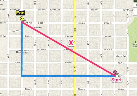 如下图(二维特征的情况)蓝线的距离即是曼哈顿距离(想象你在曼哈顿要从一个十字路口开车到另外一个十字路口实际驾驶距离就是这个“曼哈顿距离”,也称为城市街区距离),红线为欧几里得距离: