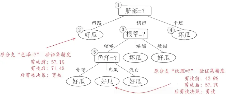 ①预剪枝:是在决策树生成过程中,限制划分的最大深度、叶子节点数和最小样本数目等,以减少不必要的模型复杂度;