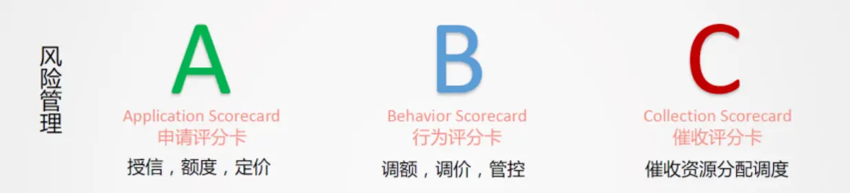 其中,对于(贷前)申请前的风控模型,也称为申请评分卡--A卡。A卡是风控的关键模型,业界共识是申请评分卡可以覆盖80%的信用风险。此外还有贷中行为评分卡B卡、催收评分卡C卡,以及反欺诈模型等等。
