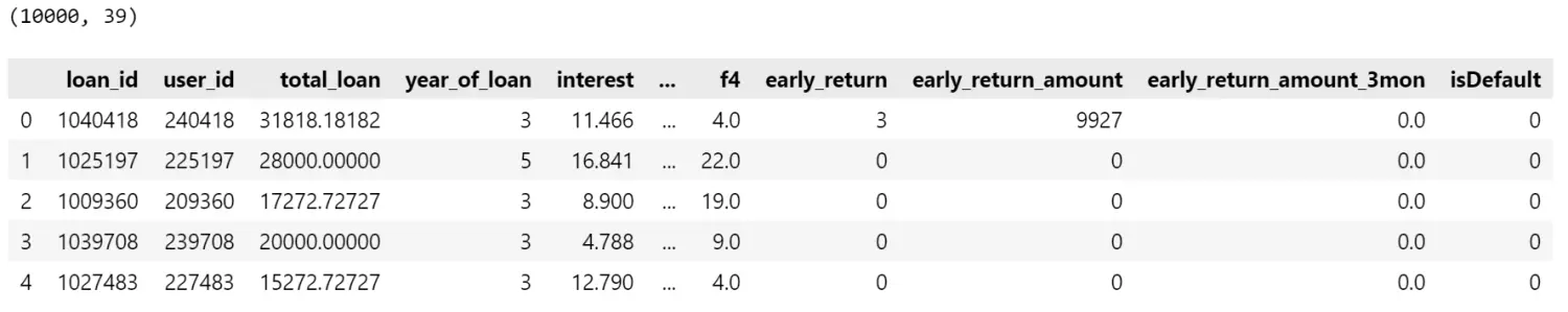 数据有10000条样本,38维原始特征,其中isDefault为标签,是否逾期违约。