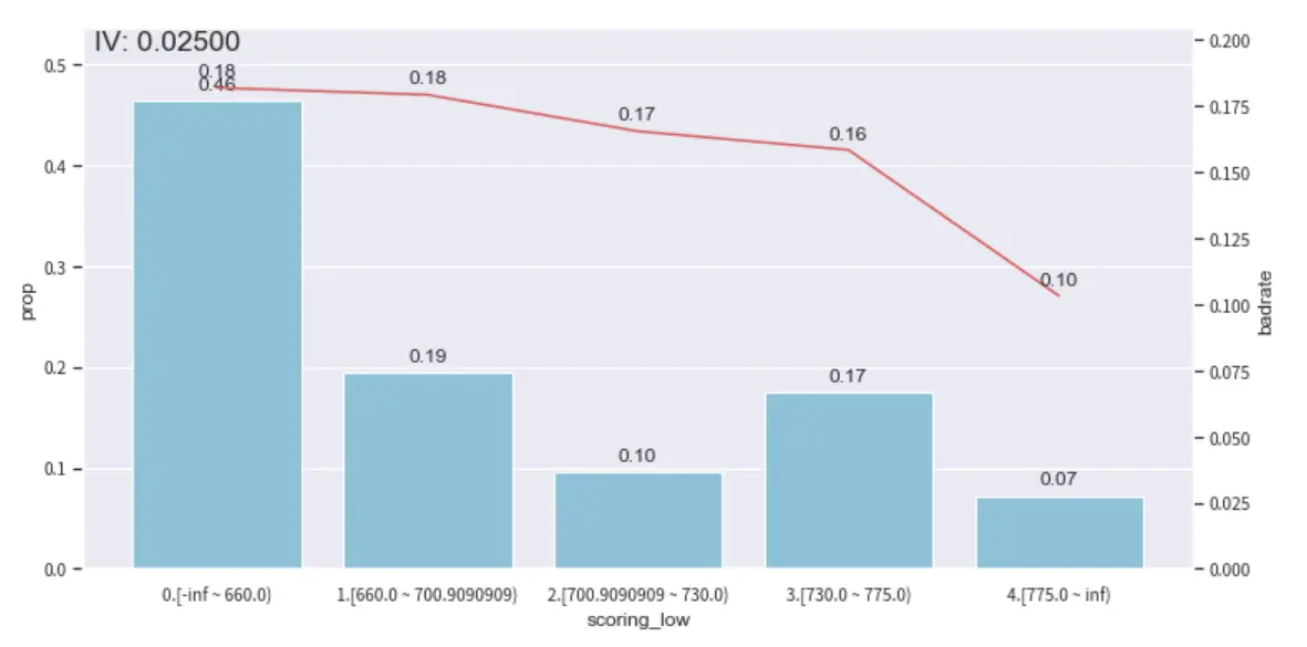 我们可以查看下ebt_loan_ratio这个变量的分箱情况,根据bad_rate趋势图,并保证单个分箱的样本占比不低于0.05,去调整分箱,达到单调性。(其他的特征可以按照这个方法继续调整,单调性调整还是挺耗时的)