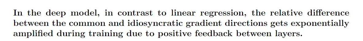 在深度模型中,由于层之间的反馈加强了有相干性的梯度,存在相干性梯度的特征(W6)和非相干梯度的特征(W1)之间的相对差异在训练过程中呈指数放大。从而使得更深的网络更偏好相干梯度,从而更好泛化能力。