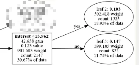 在金融风控领域是很注重决策的可解释性,有时我们可能发现某一个叶子节点的决策是不符合业务解释性的。比如,业务上认为利率越高 违约概率应该越低,那我们上图的节点就是不符合业务经验的(注:这里只是假设,实际上图节点的决策 还是符合业务经验的)