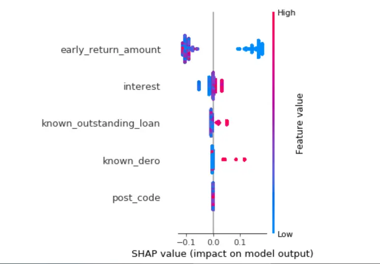 SHAP基于Shapley值,Shapley值是经济学家Lloyd Shapley提出的博弈论概念。 它的核心思想是计算特征对模型输出的边际贡献,再从全局和局部两个层面对“黑盒模型”进行解释。如下几行代码就可以展示该模型的变量对于决策的影响,以Insterest历史利率为例,利率特征值越高(蓝色为低,红色为高),对应shap值越高,说明决策结果越趋近1(在本例金融风控项目里面也就是数值越大,越容易违约)