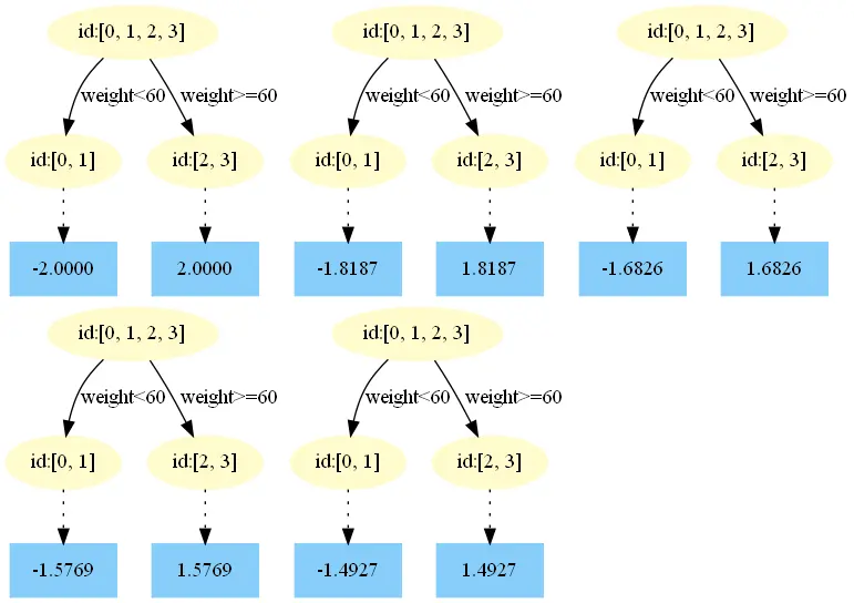 当我们在example.py中新增配置业务先验约束(令age需要和标签呈负相关)的GBDT。此时,在本实验数据集age特征的各分裂点可能都是不符合业务逻辑,都没有选用,如下运行结果: