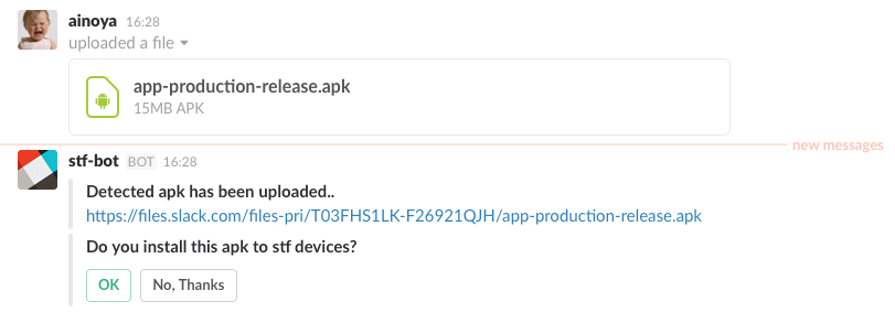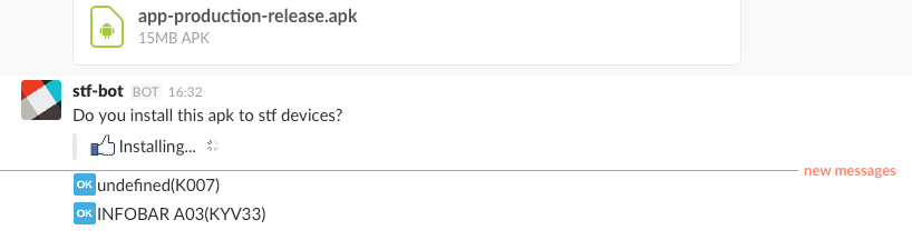 - Install apk to all stf devices automatically when someone uploads apk to Slack