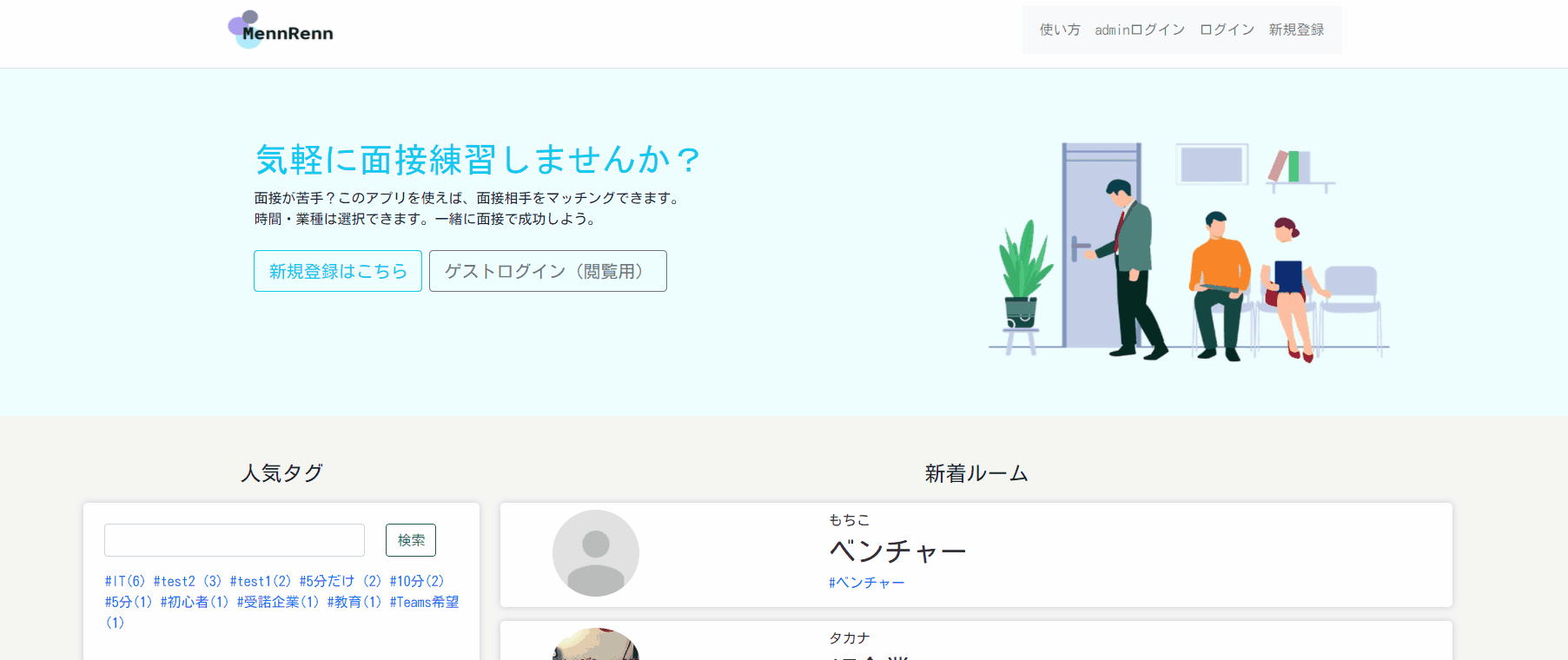 終身雇用が当たり前だった時代から、自分のスキルに見合った企業への転職が増加しており、日本の働き方が変化しています。転職活動するうえで、合否を大きく分けるのが面接です。「スキルはあるのに面接で失敗してしまった」という人も多いはずです。ただし、面接練習をしようと考えるも1人で練習することが難しいです。この難点を、「MennRenn」を使うことで練習相手を見つけ、面接力を高めようというアプリです。このアプリを活用することで、就活・転職している方のサポートができればよいと考えております。