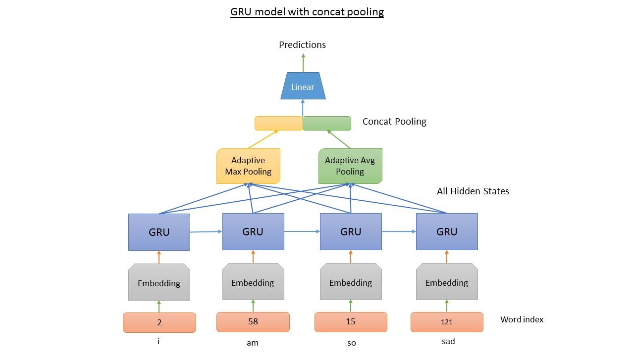 Here we implement concat pooling with a GRU. (See notebook for more details.)