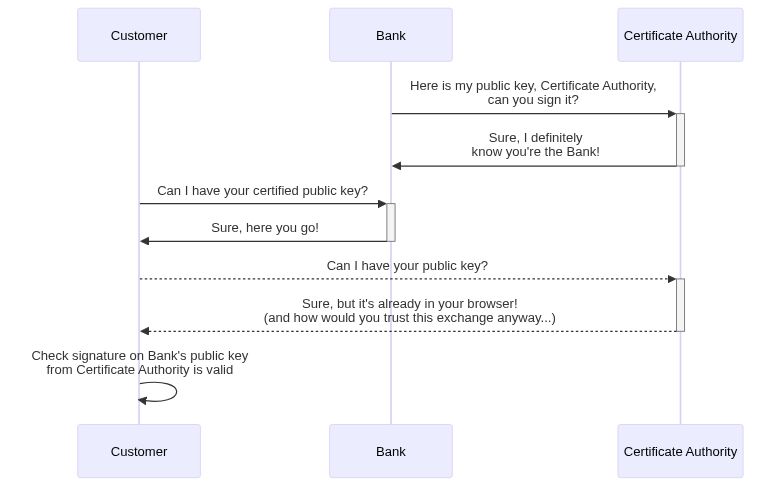 - Key point: Trust is placed in certificate authorities to correctly associate keys with entities real identity and there is no enforced hierarchy of trust among multiple certificates