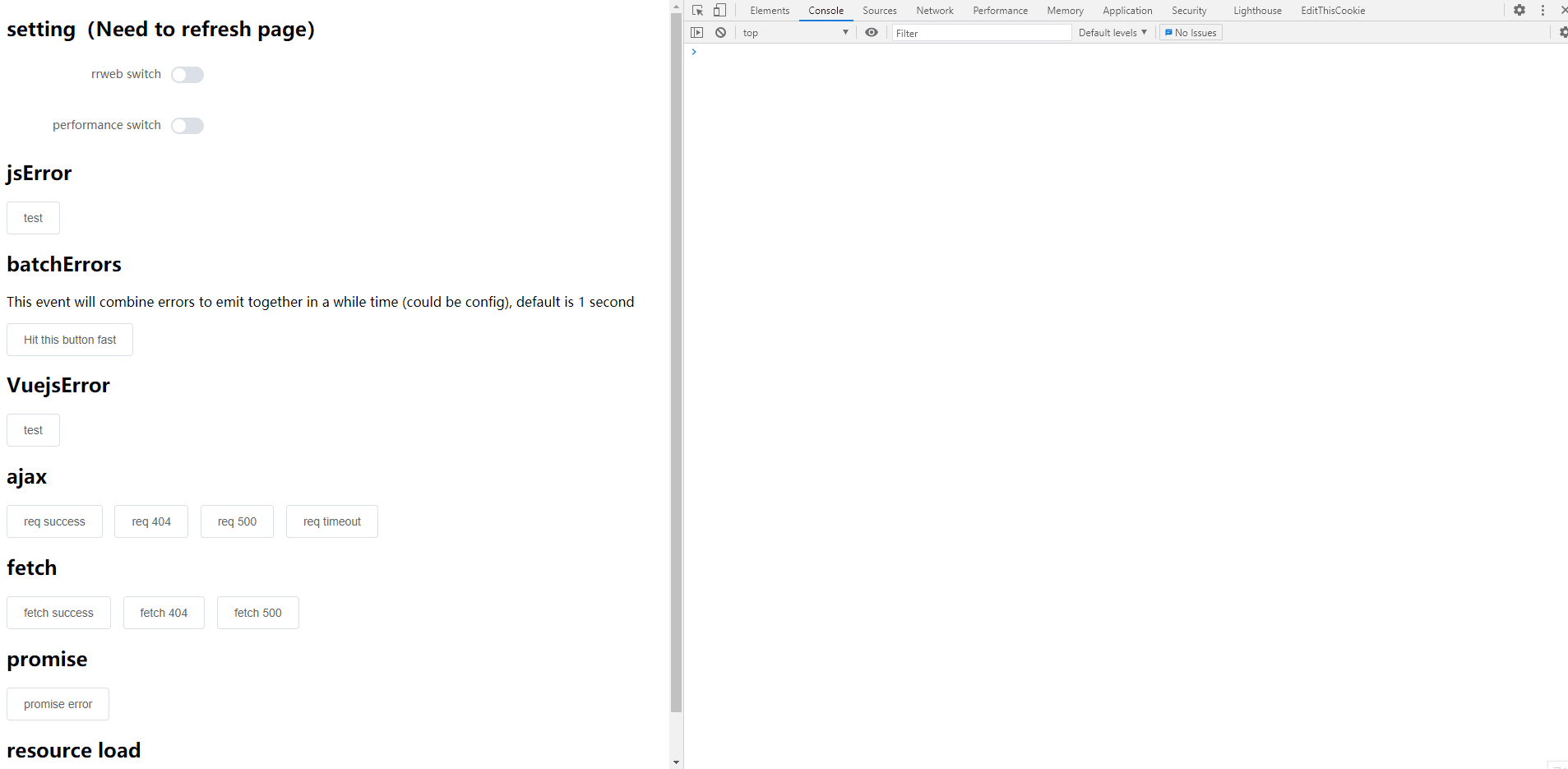 - Error observe, includes js error, unhandle rejection error, http error and resource error