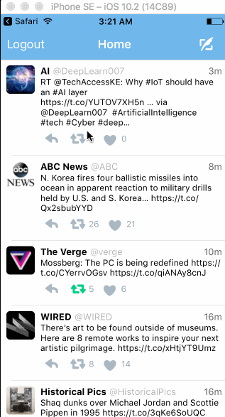 - Tweet Details Page: User can tap on a tweet to view it, with controls to retweet, favorite, and reply.