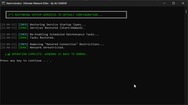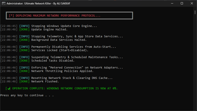 Metered Connectionon both WiFi and Ethernet interfaces, forcing Windows to natively restrict background downloads. - Flushes Network Stack: Resets DNS and Winsock to clear any pending ghost connections.