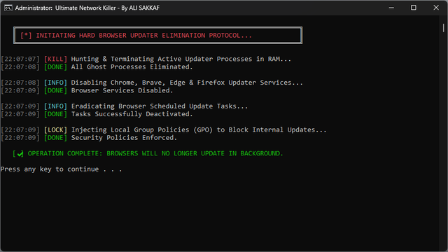 GoogleUpdate.exe,BraveUpdate.exe,MicrosoftEdgeUpdate.exe) instantly. - Service Lock: Disables the browser-specific update services.