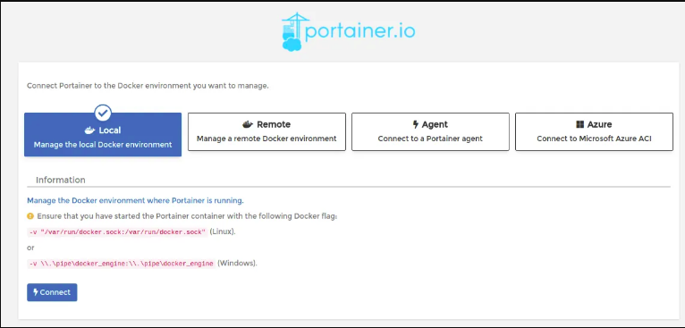 Em seguida, você deve selecionar qual tipo de instalação deseja realizar. Note que é possível administrar vários serviços de containeres, inclusive remotos. Vamos selecionar,por ora, a opção