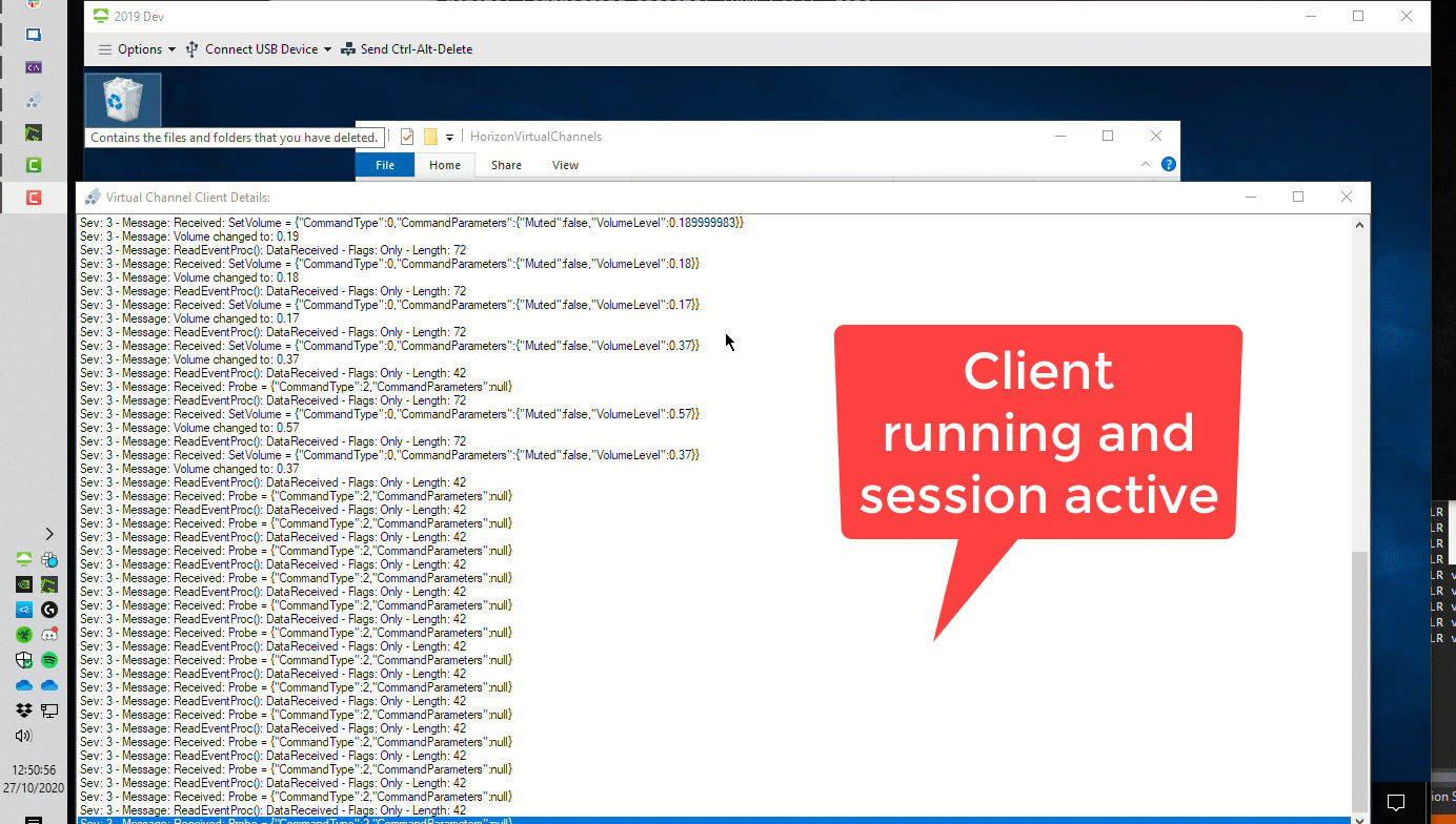 In this example, a client (running on the users device) opens a Virtual Channel to an Agent (running in the virtual desktop or application session) and synchronises the volume from the Virtual Session, to the local device, to make it easier to manage the volume.