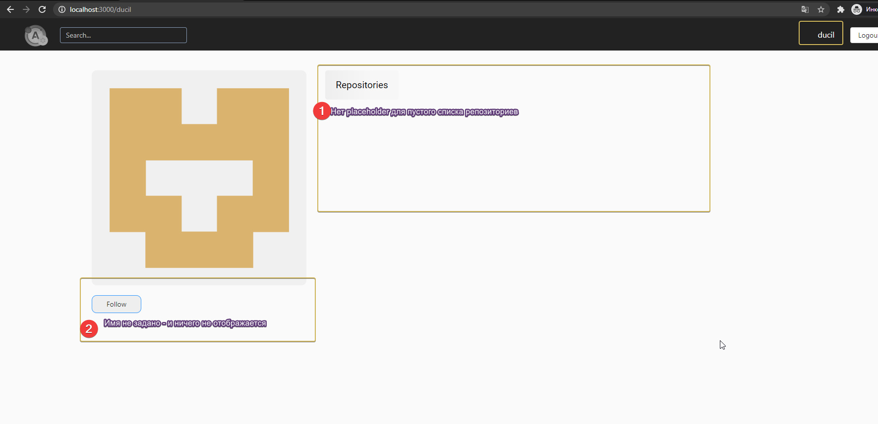 - Добавить отображение username как на github (или на свое усмотрение) на странице UserPage