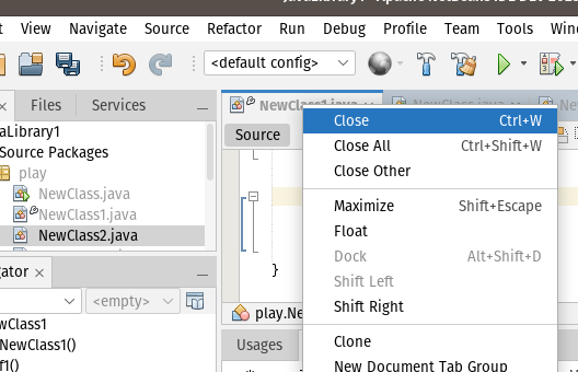 Is this intermittent for you? I can't reproduce what you're seeing. I thought it might be because I use "focus follows mouse" but disabling that didn't change it. The Could be a OS/window manager issue. The close sequence starts with the following and notice the comment about focusing the top component before continuing. netbeans/platform/core.windows/src/org/netbeans/core/windows/actions/CloseWindowAction.java Lines 74 to 89 in cac7e65