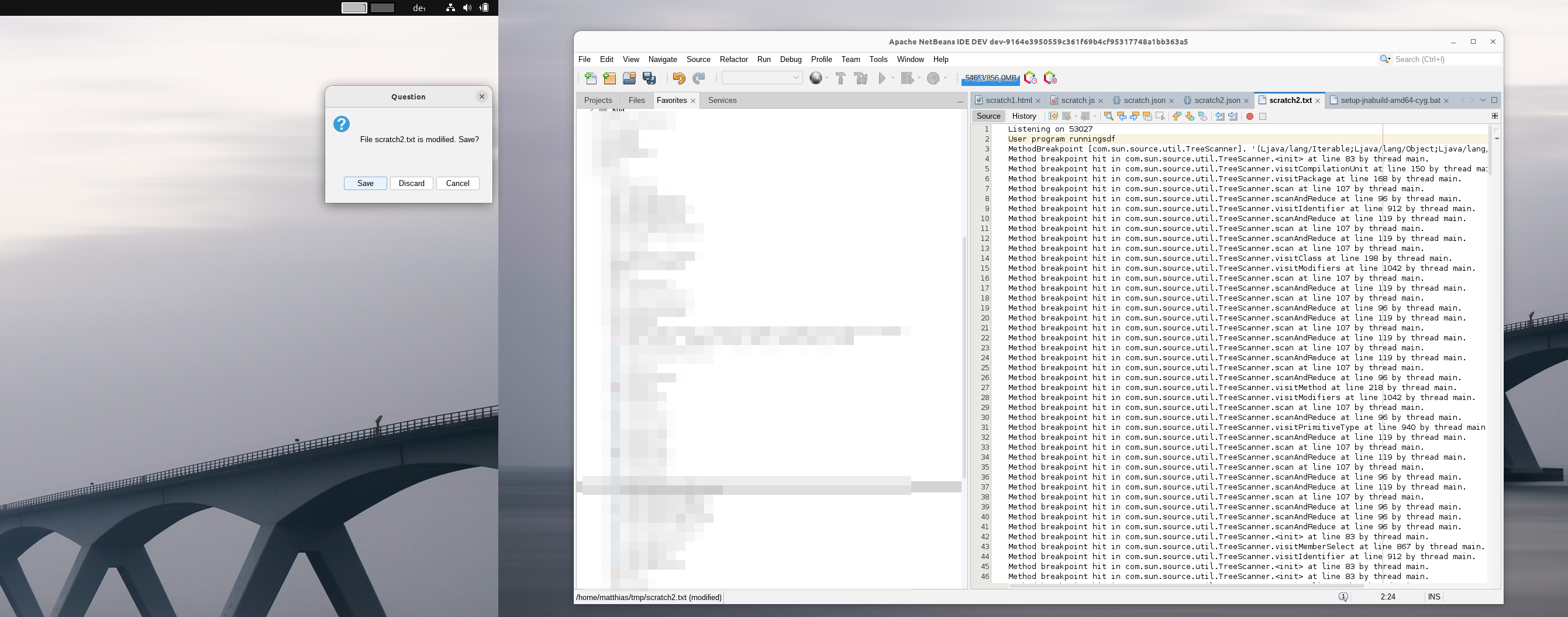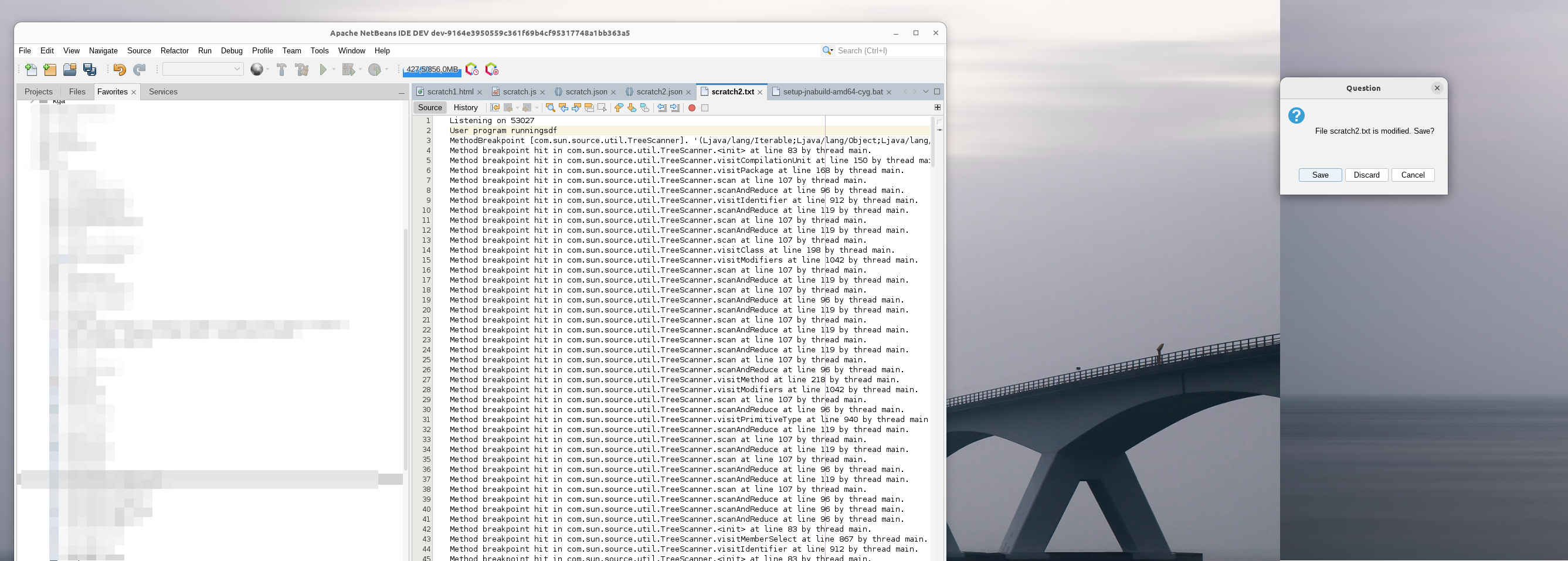 Doing the same steps, the problem (stemming from no focused component or window) is intermittent; I'm guessing timing. Happens more frequently when run under the debugger. The problem may be more likely to arise when using the jVi plugin. When the user does a vi colon command, a one line window, JDialog, is brought up for the command entry. Some jVi commands invoke actions which bring up a dialog. The one line window is disappearing while the NetBeans dialog is coming up. |