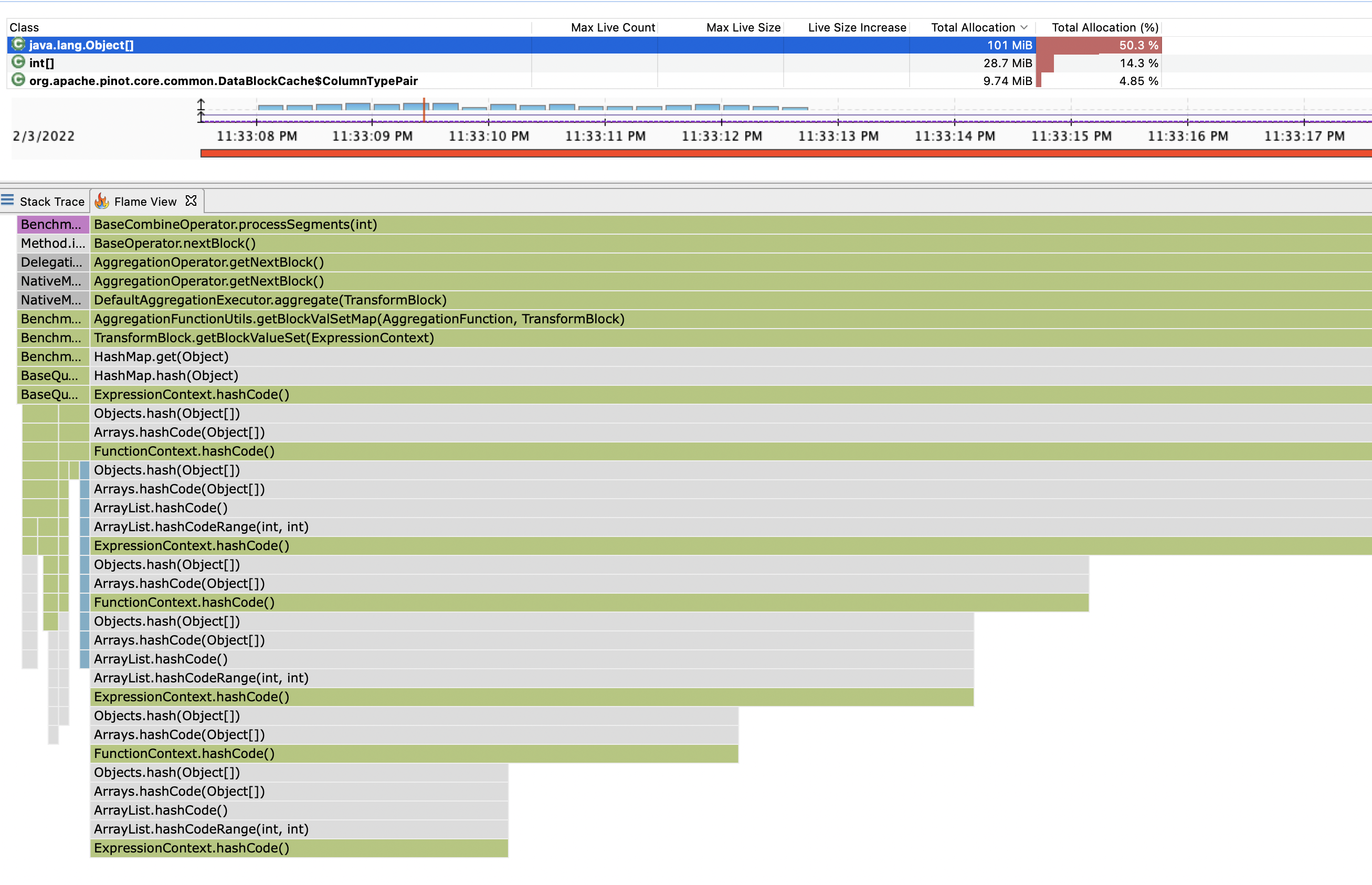 Fortunately we don’t- the frames for ArrayList are in the flame graph above. After this change, that whole stack trace disappears from allocation profiles.