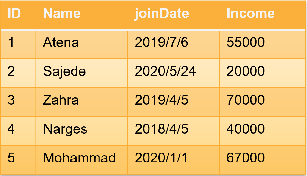 INSERT INTO employee VALUES ("Zahra",2019/4/5,70000)