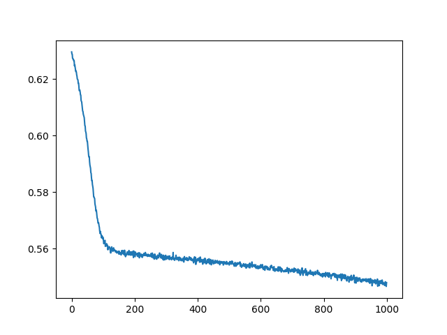 Figure above demonstrates the loss function when the pre-trained model is trained for 1000 more epochs using SGD at a learning rate of 0.01.
