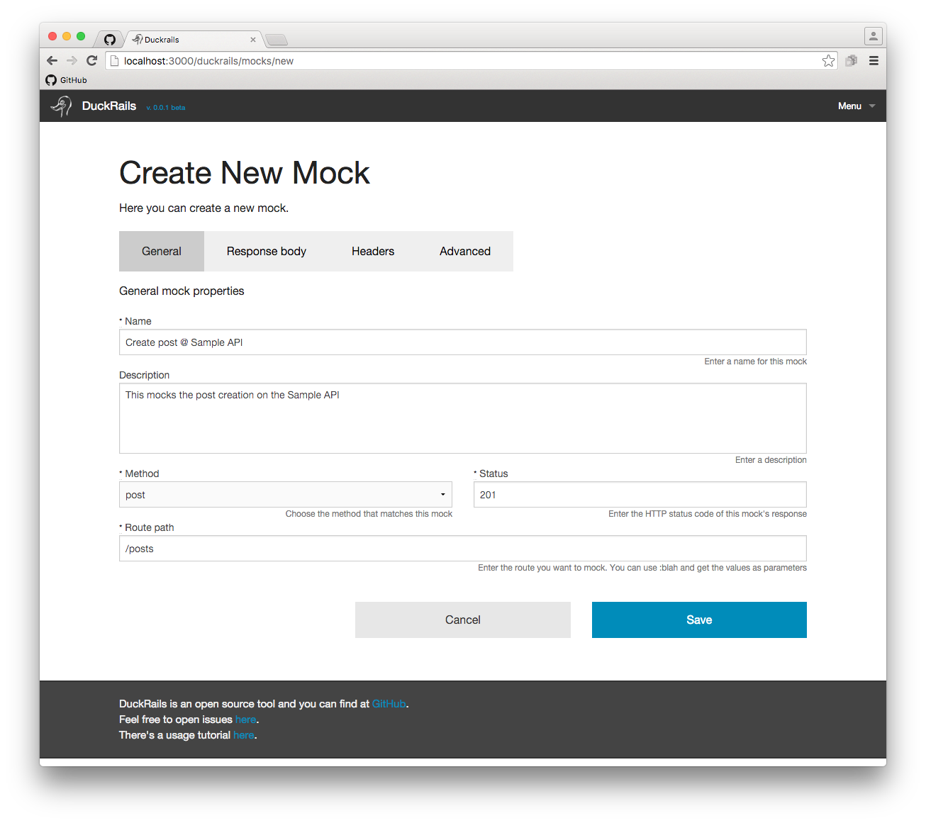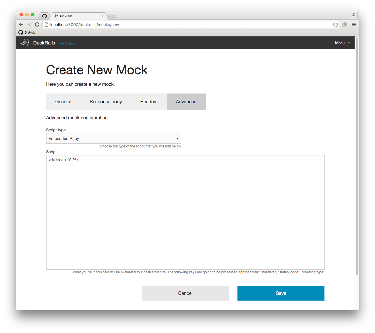 The application allows to create new routes dynamically to which developers can assign static or dynamic responses: