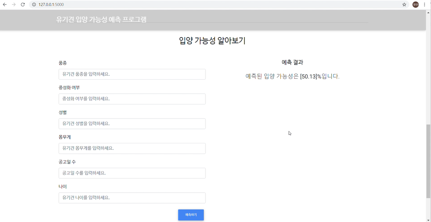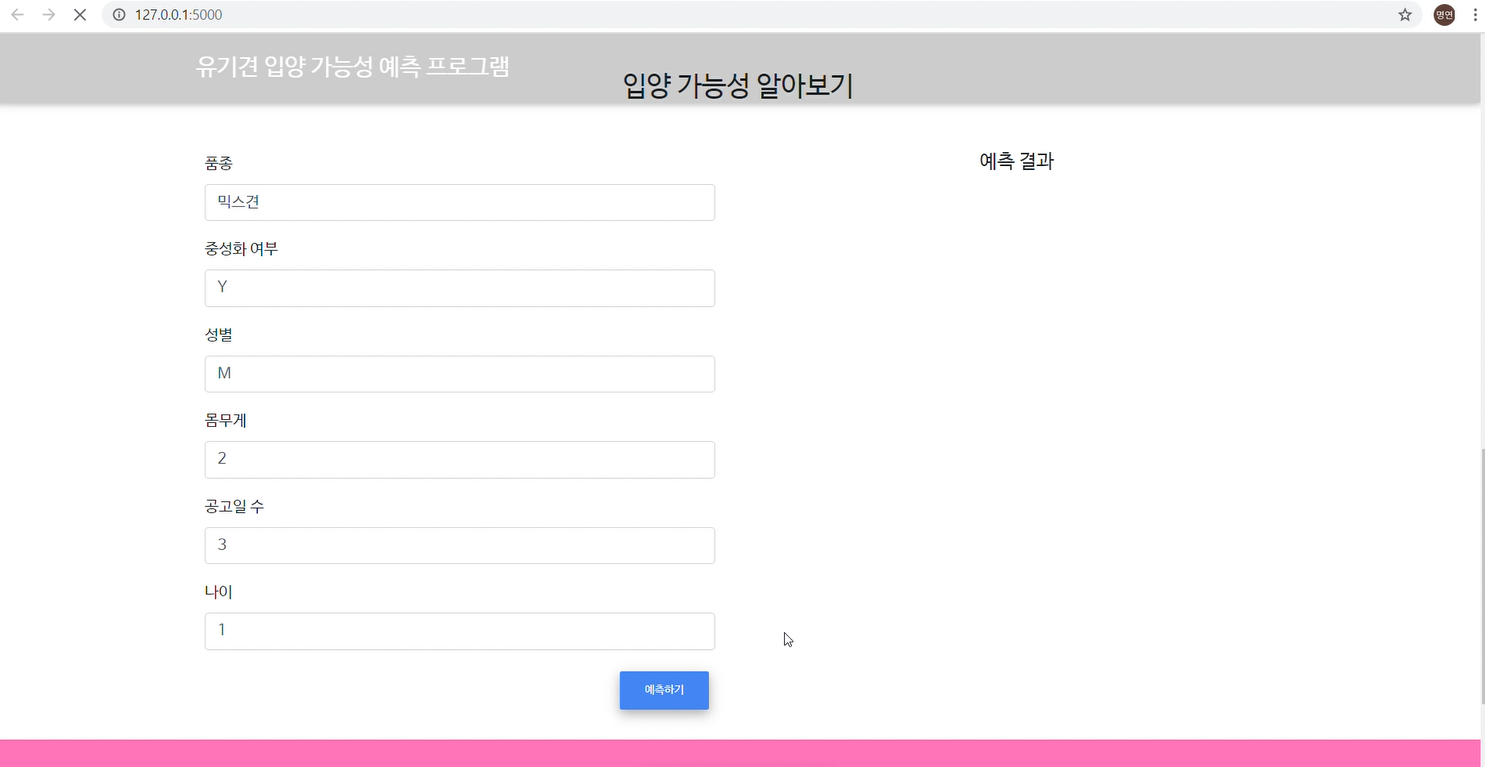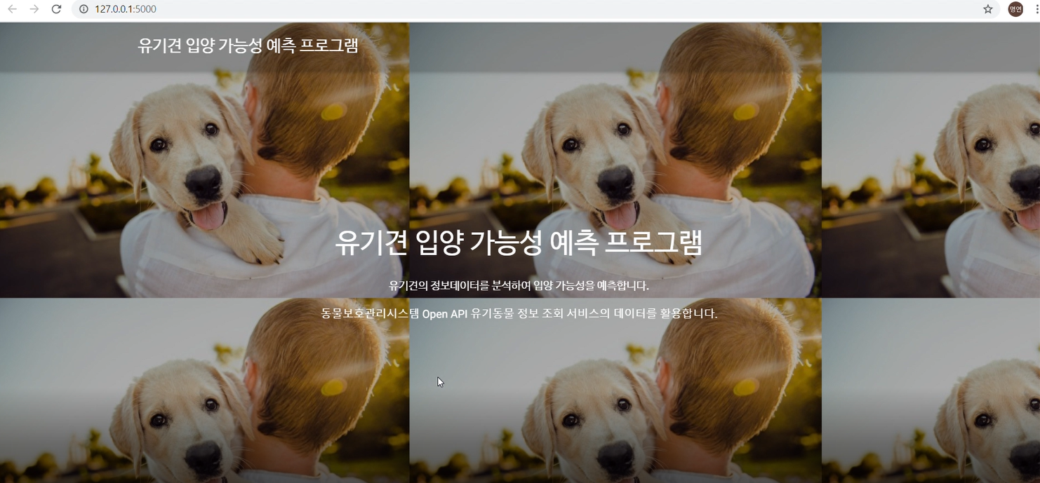 bigdata 2020 공개SW 개발자대회 프로젝트 유기견 입양 가능성 예측 서비스 유기견 공공데이터를 활용하여 유기견 입양 가능성 예측 모델을 구축하여 웹 서비스화 👩💻 개발자 Contributor 팀원 yunjin99 김윤진 auddus16 황명연 🗓️ 2020.07 ~ 2020.08 🛠️ Tech Stack