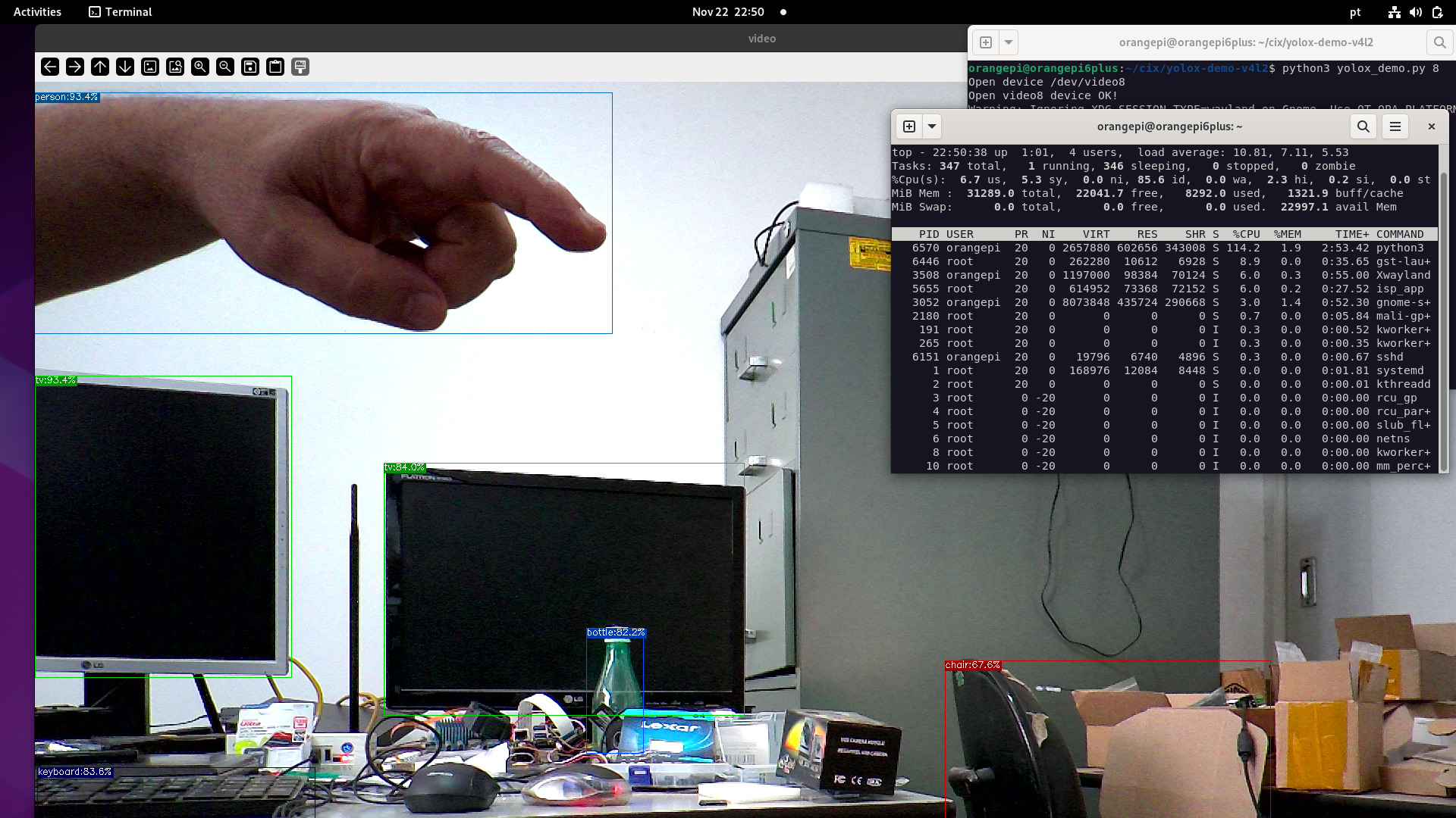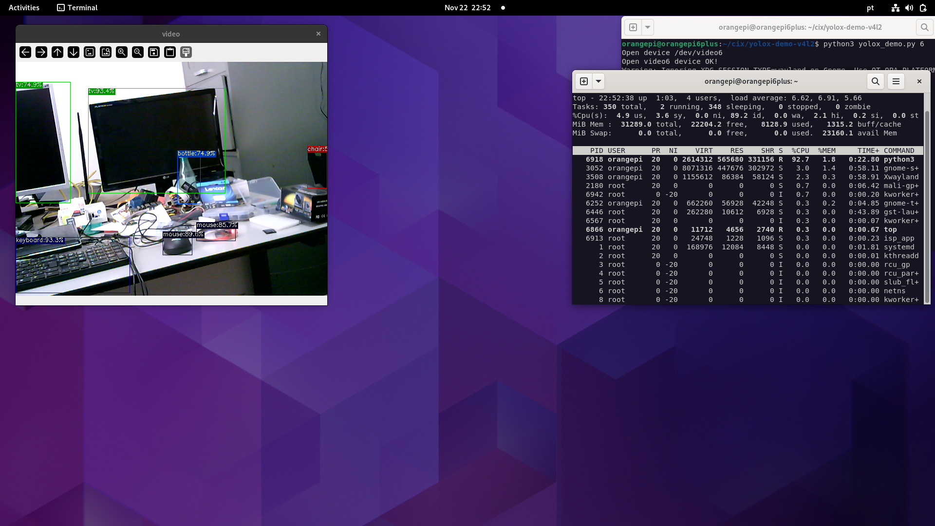 The trick is to redirect the camera output to an v4l2looback device, in the example below we can see NPU inference with live streaming using a Webcam 720p and mipi-csi ov13855 (1920x1080). Webcam does not require the use of v4l2loopback.