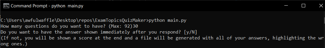 main.pywithpython main.pyor however your python3 command is called - Choose how many questions you want per run. This is if you want to have a set of only n question before finishing and checking for wrong questions, where n is the number you choose