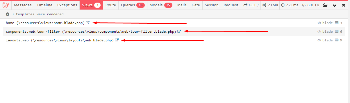 LaravelViewTemplatesWidgetby extendingPhpDebugBar.WidgetI hope this will help others to quickly go to editor through debugbar.