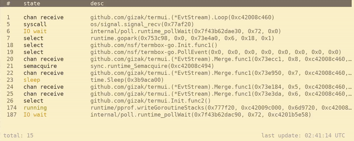 ) to enable the cursor and expand the full trace for a selected goroutine(<enter>