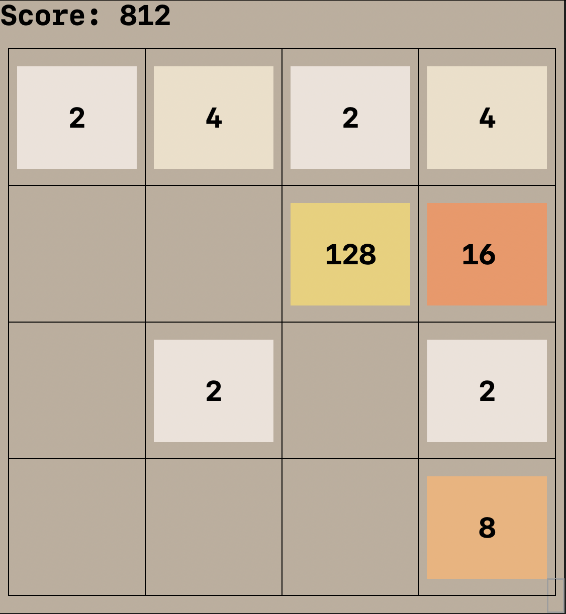 2048 in C 2048, written in C, for the terminal. Controls: Arrow Keys to move R to reset the game Running: This program uses ncurses, and I've only tested it on my Mac's terminal. Here's the command I use to run it: gcc -lcurses -lm main.c -o main && ./main