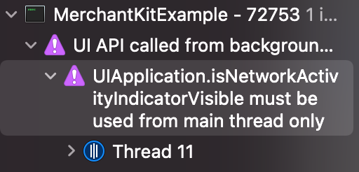 This delegate should always be called from the main thread so the bug here is inside MerchantKit itself, not the example proj.
